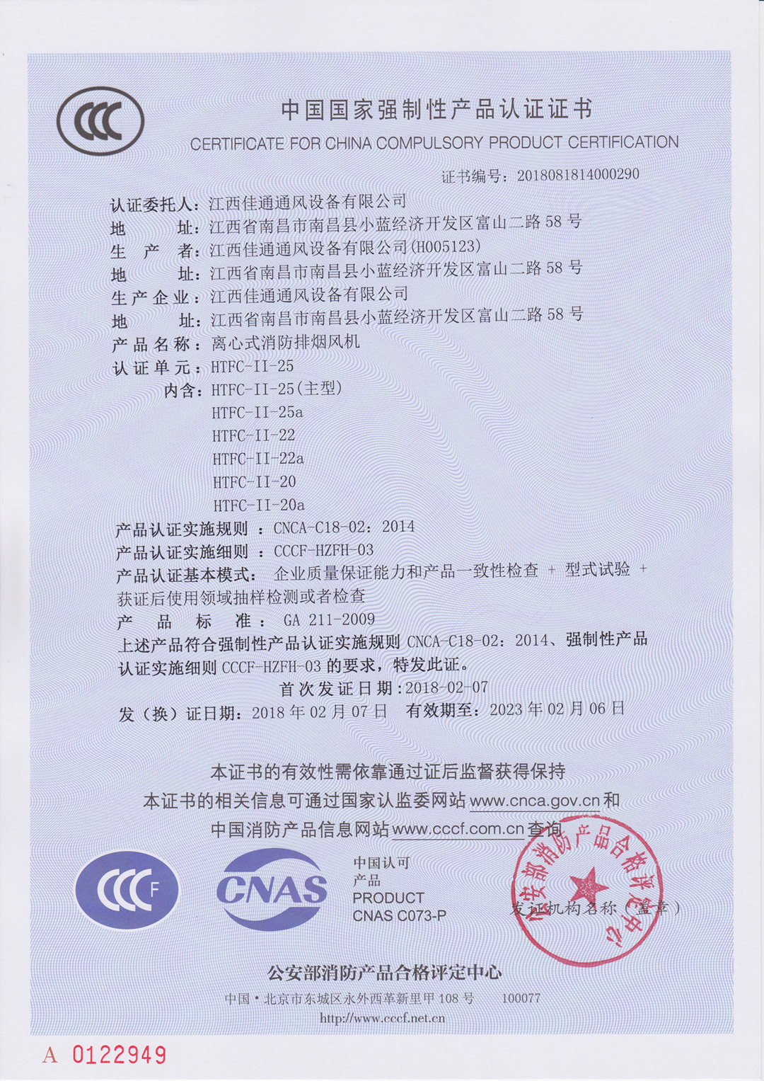 離心式消防排煙風機(雙速)HTFC-II-25(主型)消防3C認證證書