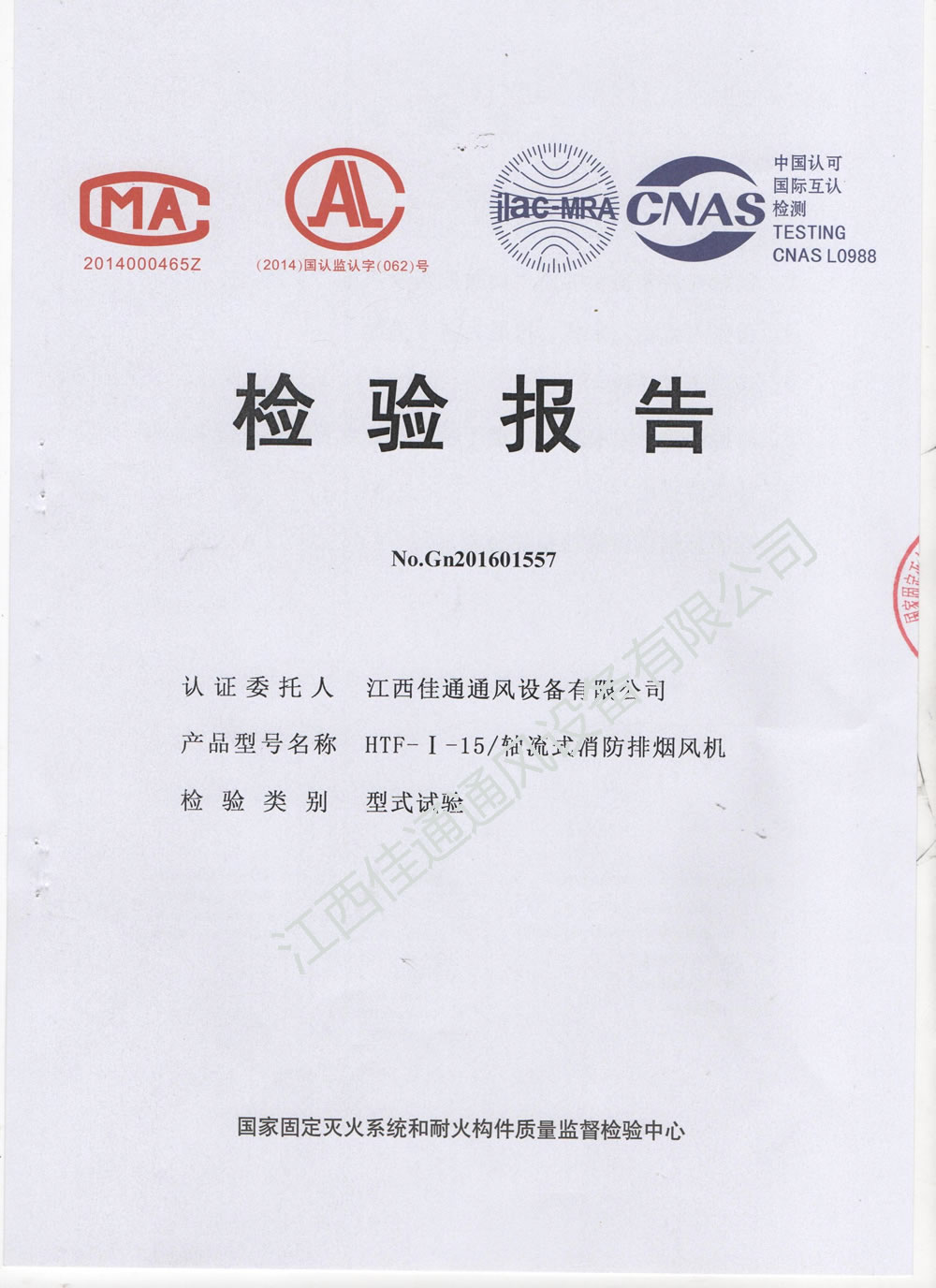 HTF-I-15軸流式消防排煙風機檢測報告