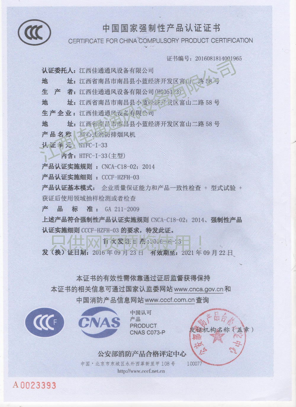 HTFC-I-33離心式消防排煙風(fēng)機(jī)3C認(rèn)證證書