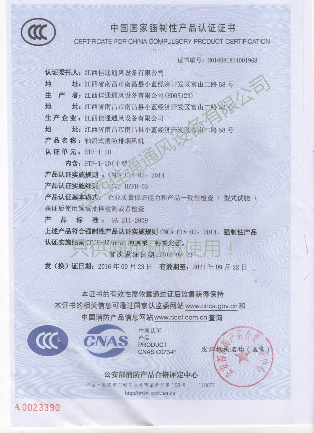 HTF-I-10軸流式消防排煙風機3C認證證書