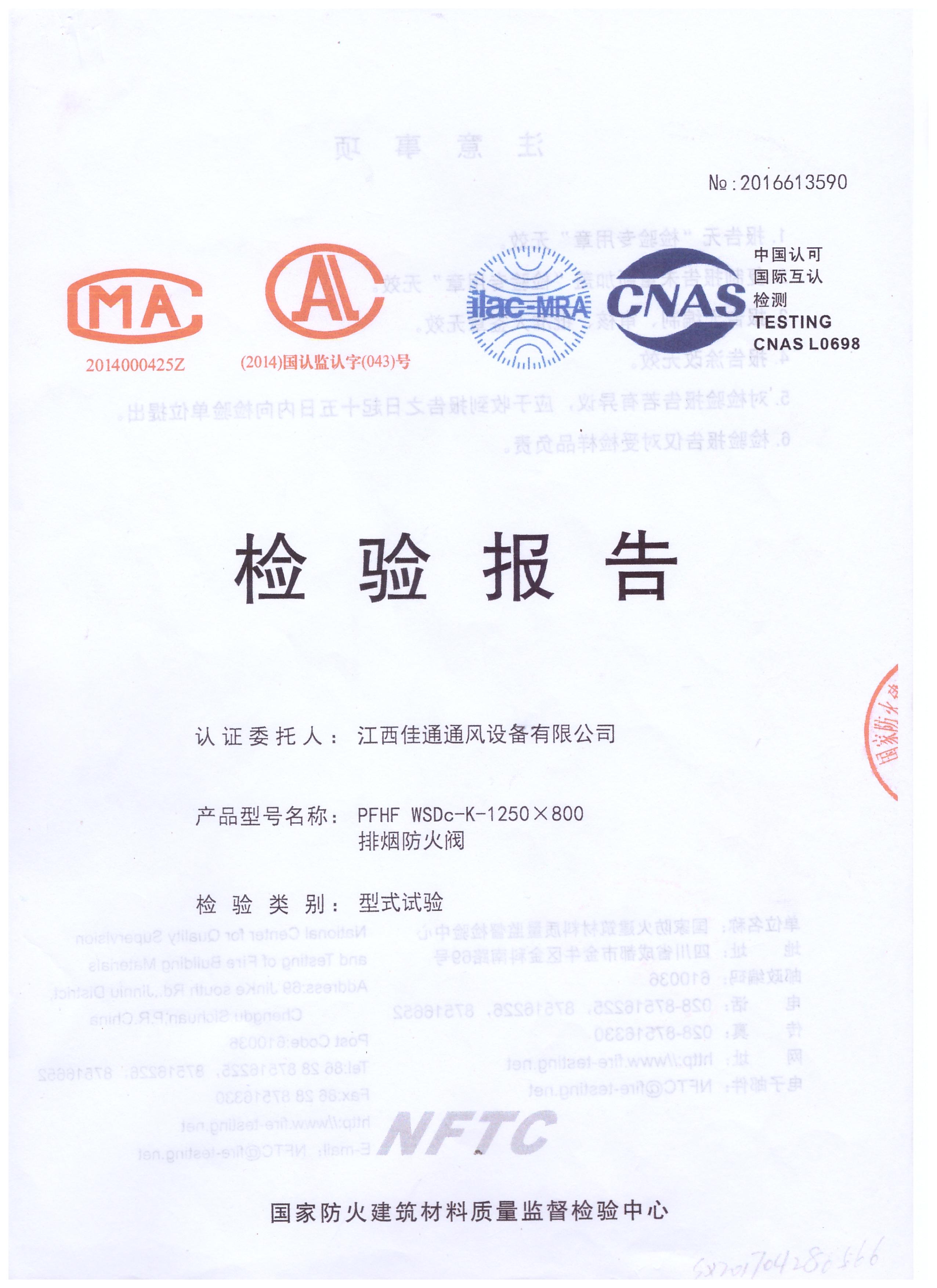 PFHF WSDc-K-1250×800排煙防火閥檢驗報告