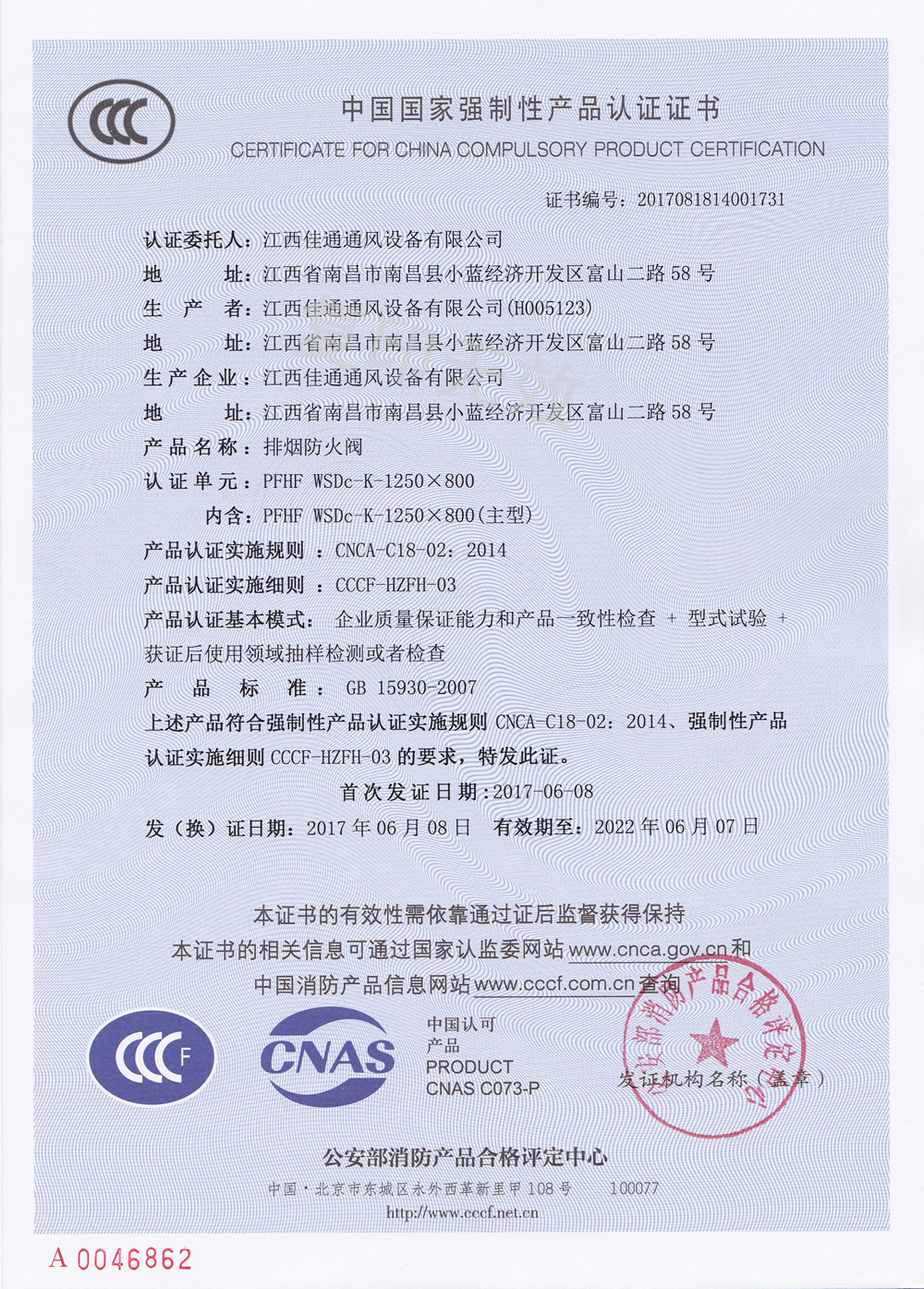 想了解更多請點擊===>>排煙防火閥3C認證證書 3C排煙防火閥 排煙防火閥