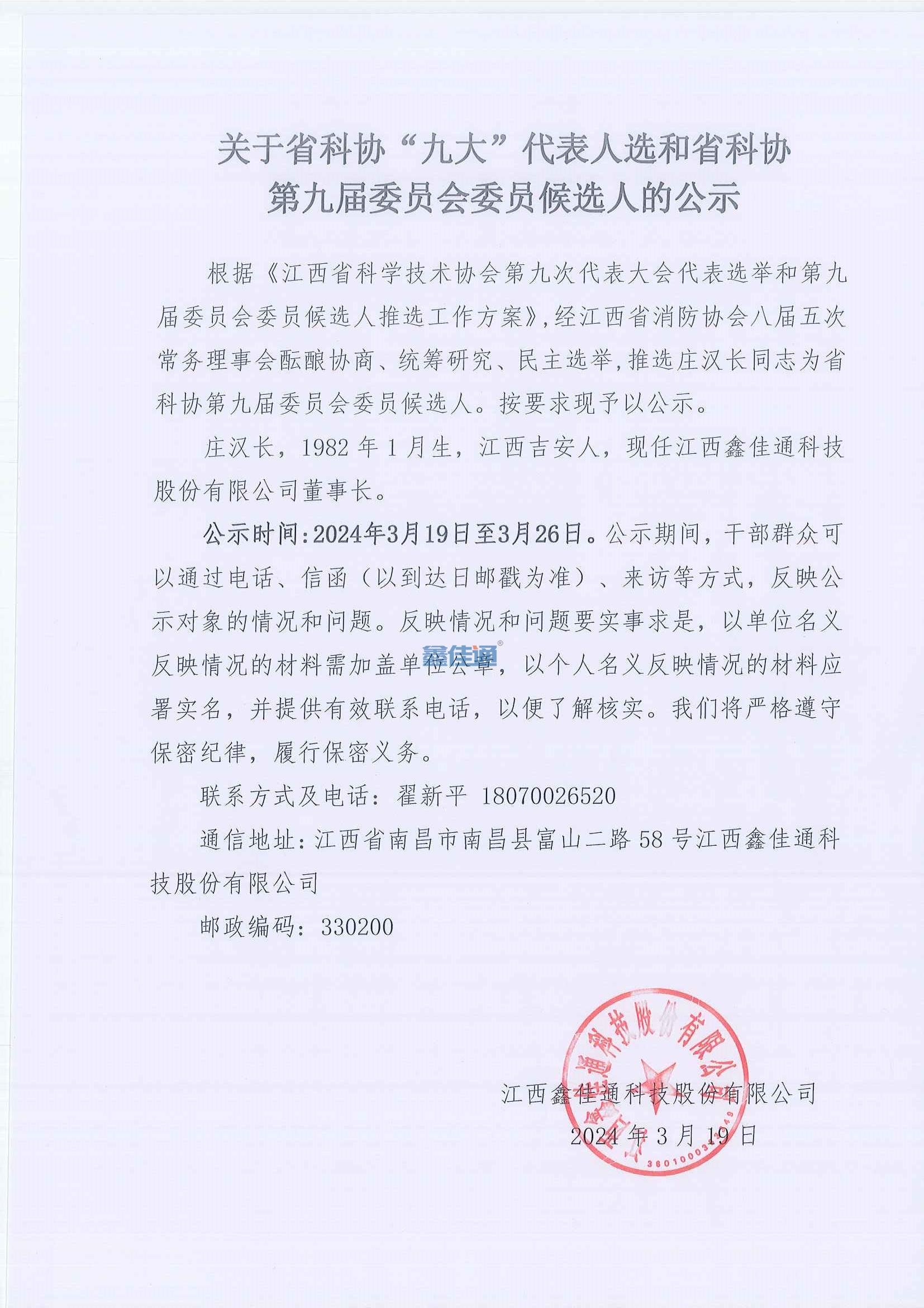 根據(jù)《江西省科學(xué)技術(shù)協(xié)會(huì)第九次代表大會(huì)代表選舉和第九屆委員會(huì)委員候選人推選工作方案》,經(jīng)江西省消防協(xié)會(huì)八屆五次常務(wù)理事會(huì)醞釀協(xié)商、統(tǒng)籌研究、民主選舉,推選莊漢長(zhǎng)同志為省科協(xié)第九屆委員會(huì)委員候選人。按要求現(xiàn)予以公示。莊漢長(zhǎng),1982年1月生,江西吉安人,現(xiàn)任江西鑫佳通科技股份有限公司董事長(zhǎng)。