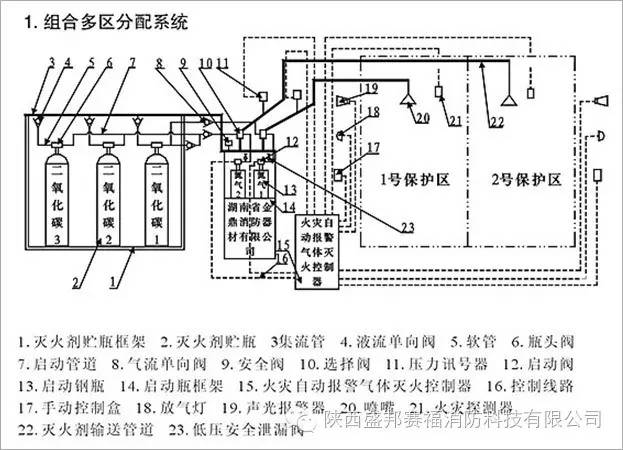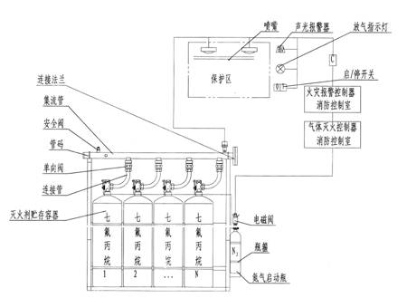 七氟丙烷滅火系統主要部件有:儲存滅火劑容器、儲存啟動氣體容器、容器閥、單向閥、連接管、安全泄壓閥、選擇閥、信號反饋裝置、集流管、電磁閥、壓力顯示器、管路、噴嘴。