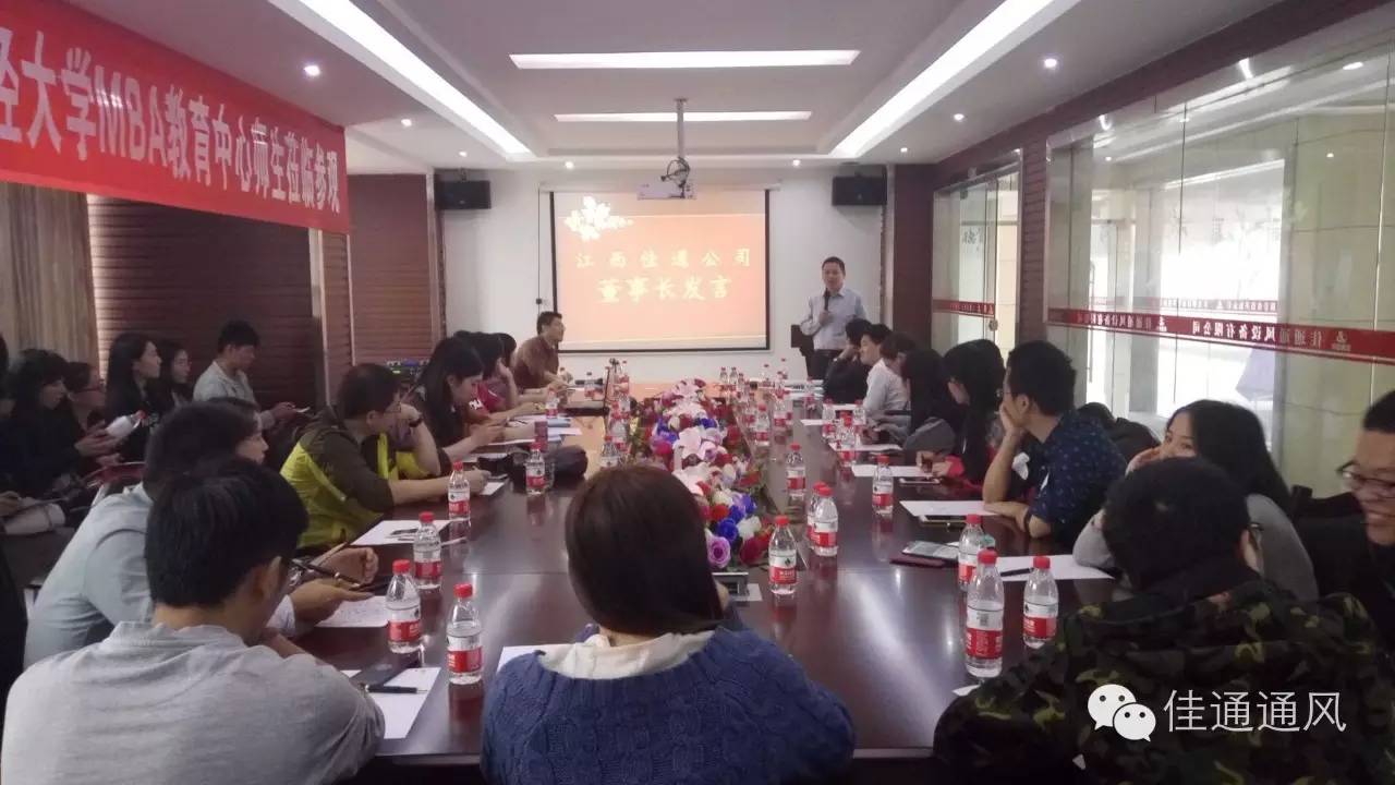 [導讀]:2016年10月16日,MBA2015級2班《人力資源管理》全體選課學生以及工商管理學院副院長寧亮來到江西佳通通風設備有限公司開展移動課堂,了解我公司以及房地產行業的組織績效管理。 江西佳通通風設備有限公司董事長莊漢長,人事處辦公室主任盧鵬、銷售專員曹影及其他工作人員進行了熱情接待,帶領老師和學生參觀江西佳通通風設▶ 語音朗讀